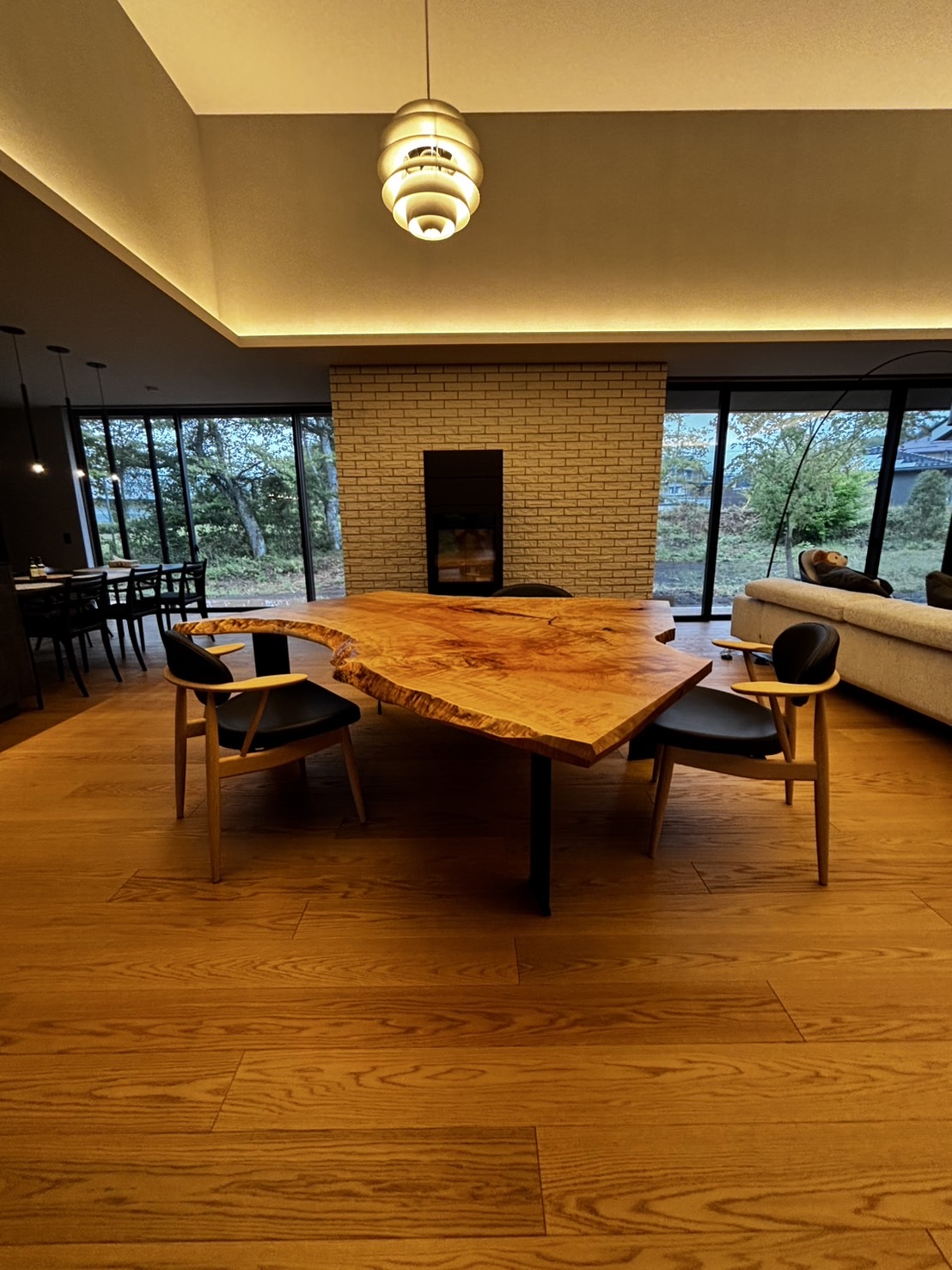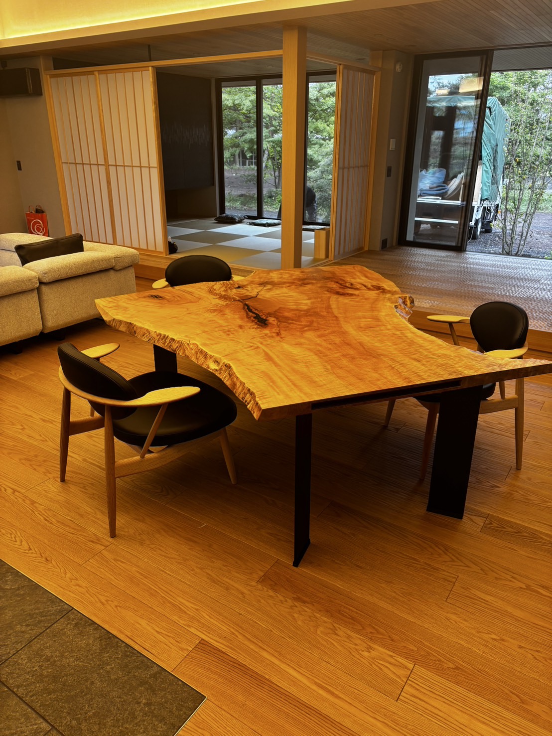 この度、大手ハウスメーカー様のご紹介で個人のお客様の邸宅へ、私どもの新ブランド「ITAKURA 2.0」の一枚板テーブルを納めました。豊かな自然に囲まれた美しい空間に、唯一無二の表情を持つ栃(トチ)の一枚板が溶け込み、新たな命を吹き込みます。