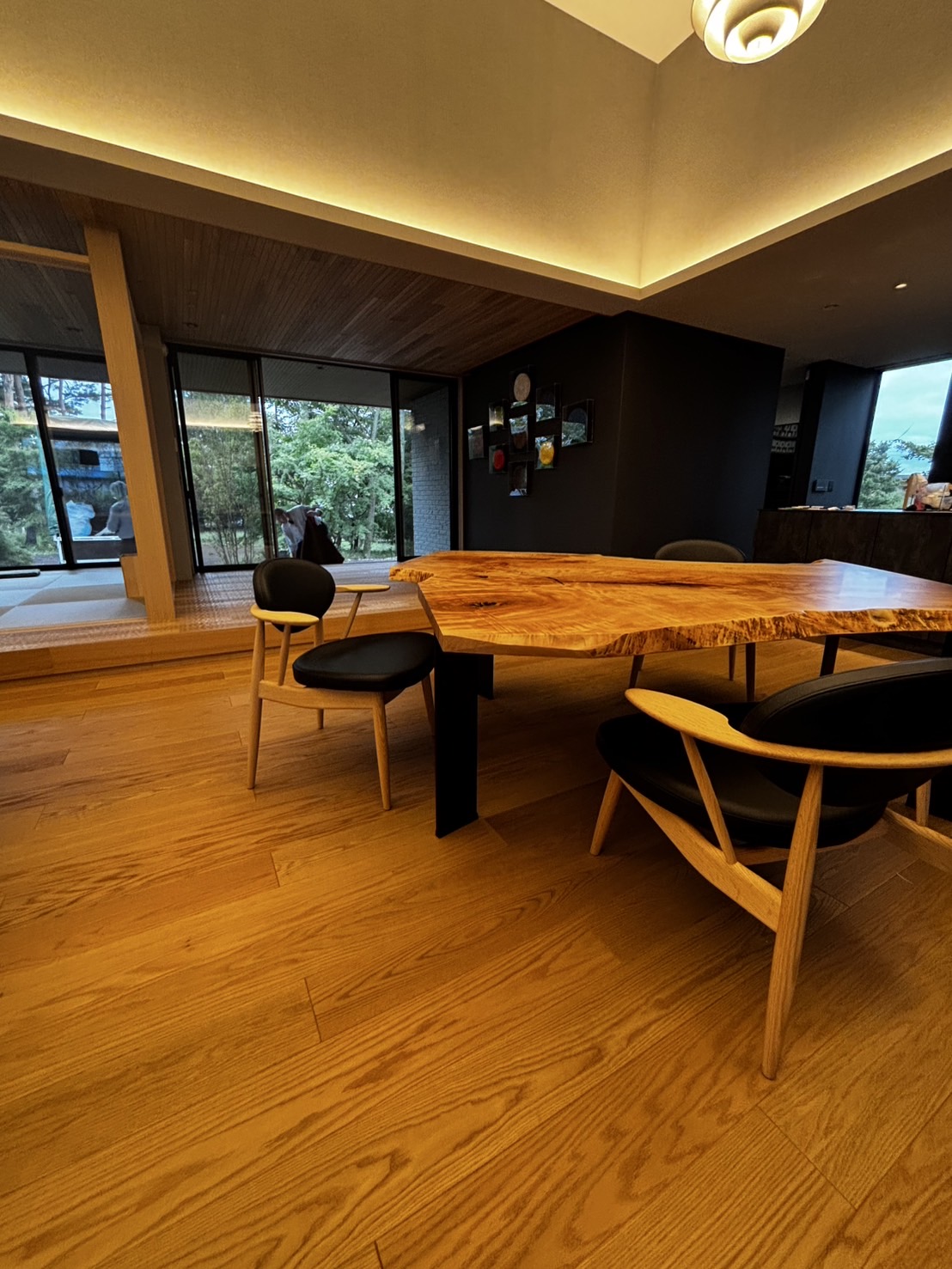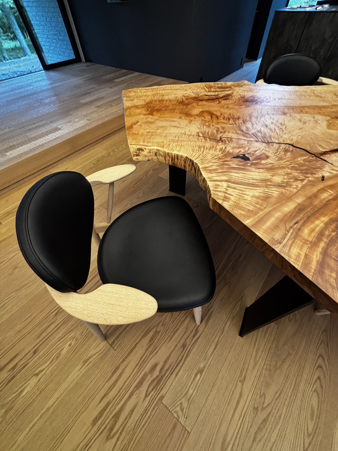 今回お選びいただいた栃の一枚板は、その象徴とも言える逸品。さざ波のように揺らめく「縮杢(ちぢみもく)」が天板全体に広がり、光の角度によってその表情を豊かに変化させます。それはまるで、軽井沢の澄んだ木漏れ日や、窓の外に広がる森の囁きを映し込んでいるかのよう。シャープなデザインのスチール脚を合わせることで、木の持つ有機的な美しさを際立たせ、モダンで高級感あふれるダイニングが完成しました。