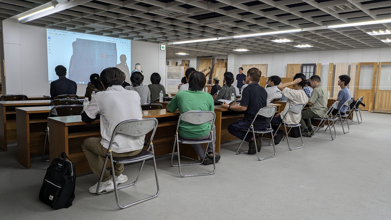 2024.08.27 ファクトリー便り 岐阜県立森林文化アカデミーの学生の方々が弊社を見学されました 8月24日に、岐阜県立森林文化アカデミーの学生の方々が板蔵ファクトリーを見学されました。 まず、弊社の親会社のヤマガタヤ産業(株)の社長による挨拶と会社説明を行ったのち、二手に分かれてショールームと工場を見学しました。 ショールームの一枚板や家具に大変興味を持ってくださり、大変有意義な時間になりました。