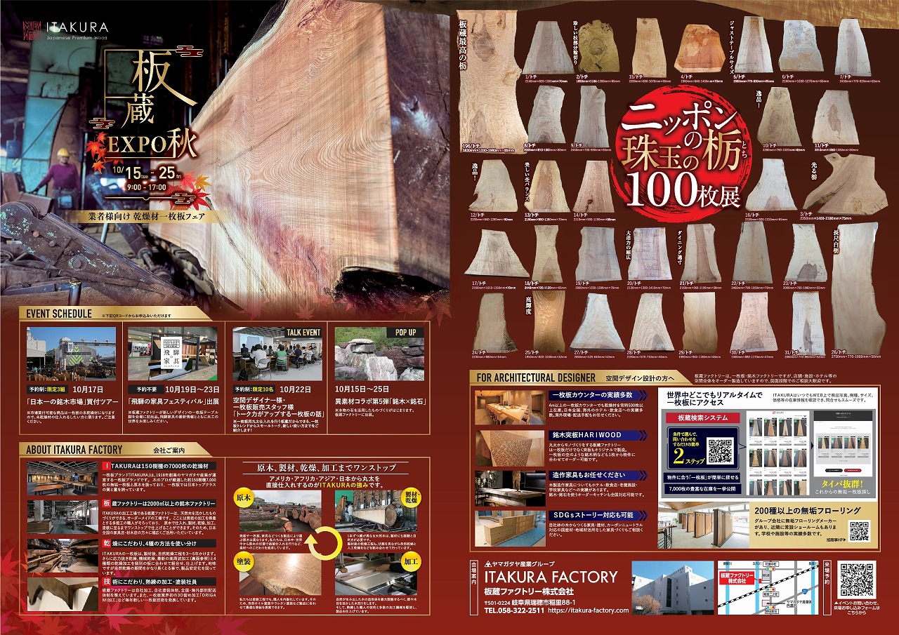 さらに、期間中には岐阜県銘木協同組合での未乾燥材買い付けツアーや、一枚板についてのトークイベントなどっも開催いたします。