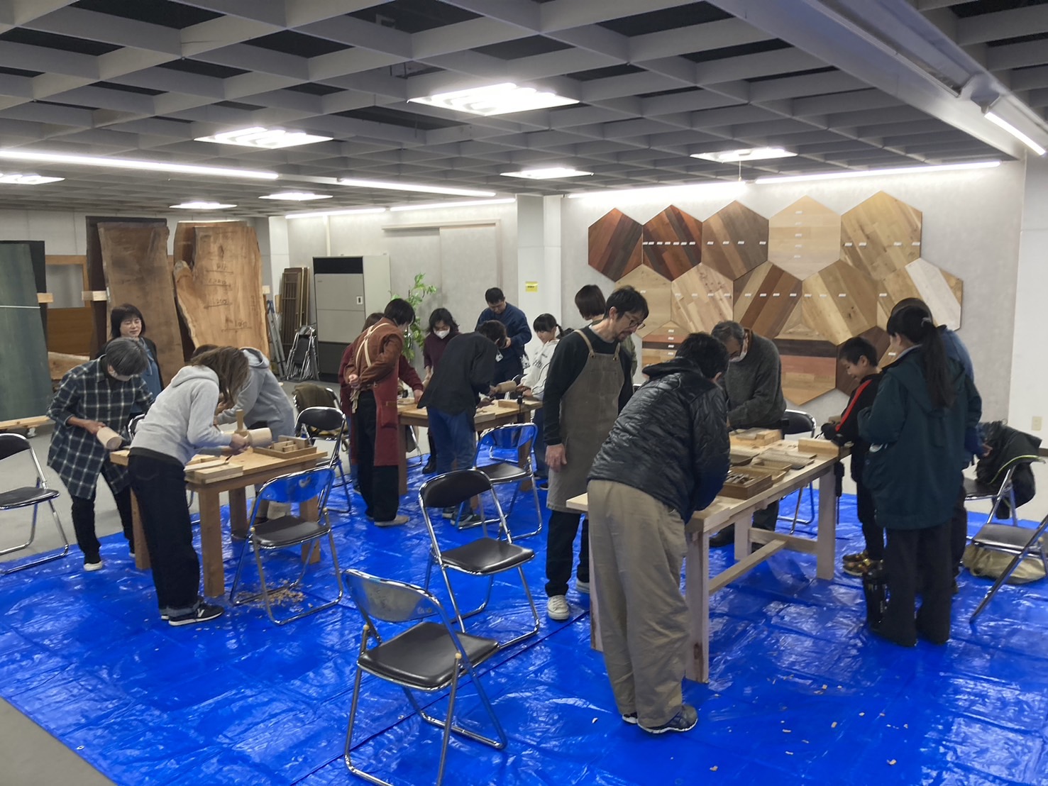主催は、弊社の親会社であるヤマガタヤ産業がメインとなって運営している団体「ぎふの木ネット協議会」で、木に触れる体験を通して木の良さや温かみを知ってもらう趣旨で開かれました。