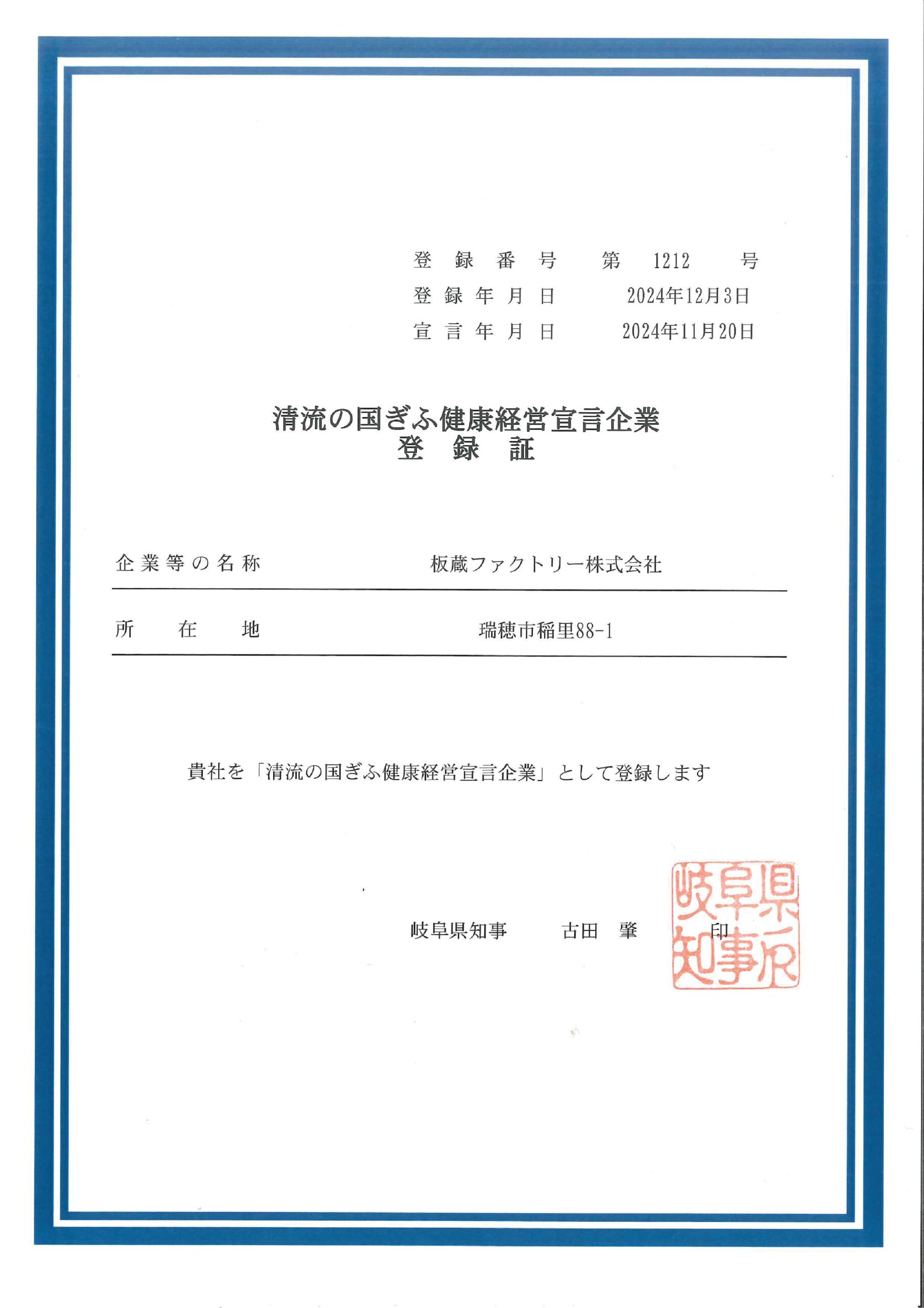 2024.12.26 ニュース 板蔵ファクトリーは「清流の国ぎふ健康経営宣言企業」に登録されました 板蔵ファクトリーは、岐阜県より「清流の国ぎふ健康経営宣言企業」に登録されました。 今後も岐阜の企業として健康経営に取り組んでいきますy。