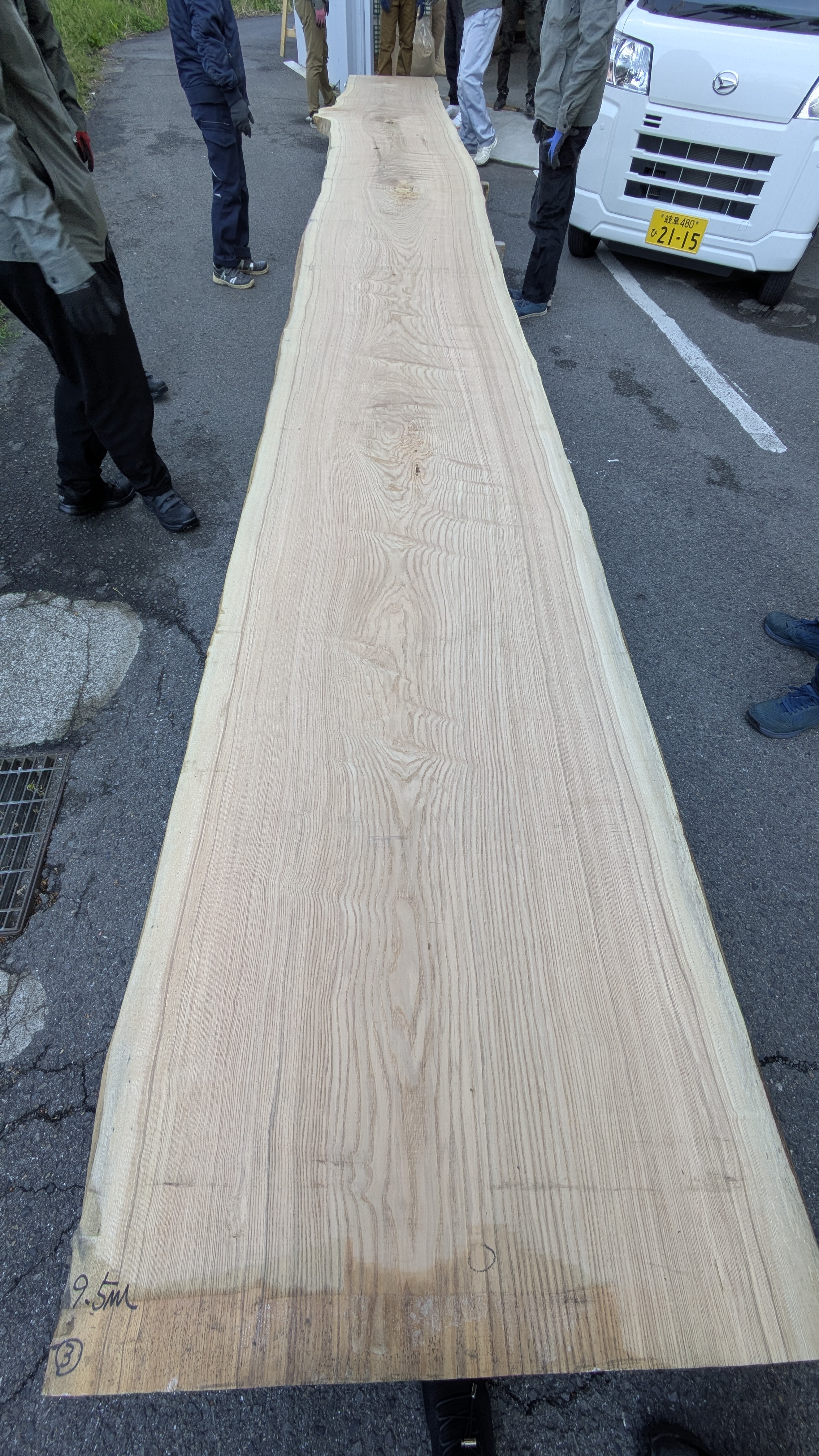 先日、板蔵ファクトリーに大変長い、9mオーバーのタモ一枚板が来ました。