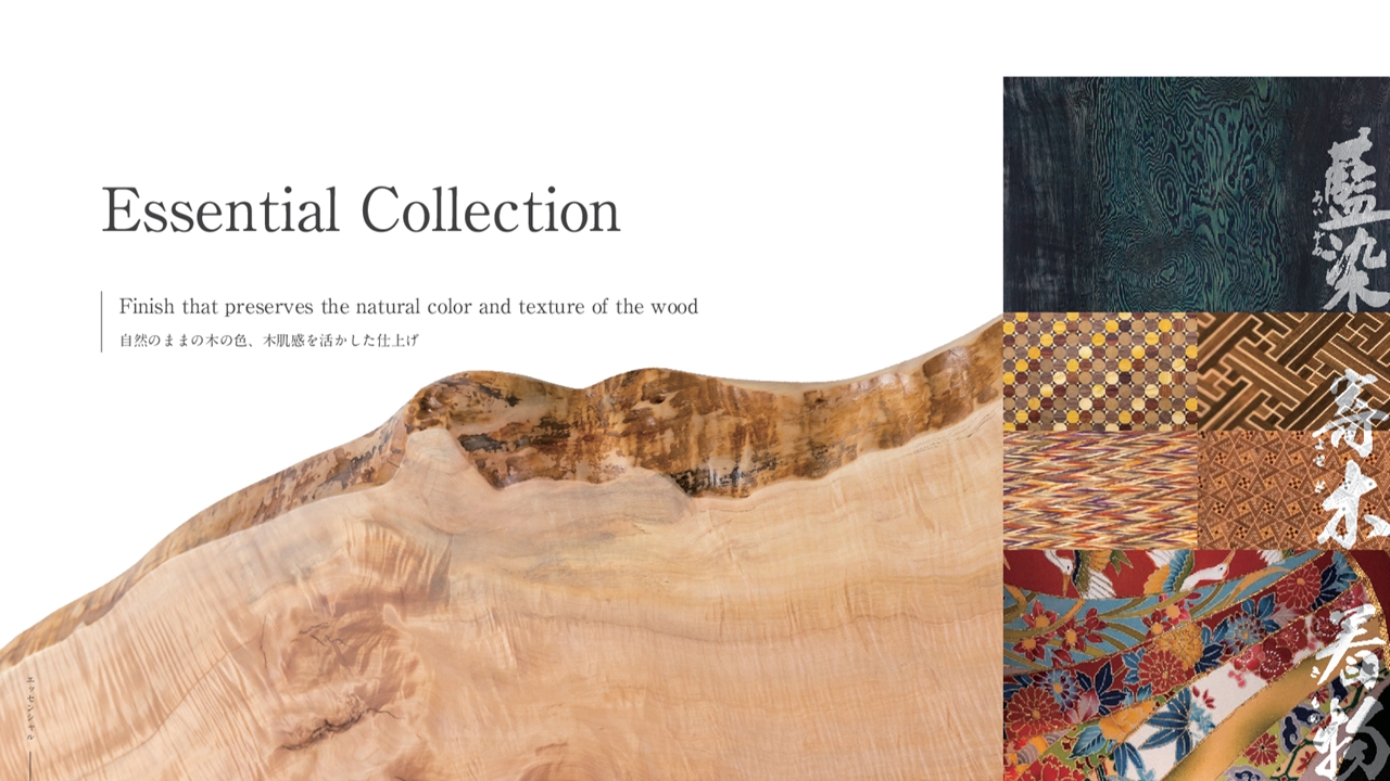 日本人の意匠性を魅せる、伝統的に用いてきた銘木素材と木工加工技術の掛け合わせ。この魅力を伝えるべく、ライブエッジを活かした無垢一枚板を日本語そのままの「Meiboku」として海外へ発信します。さらに、繊細な日本の加工技術と、その素材に込められたストーリーも提案します。