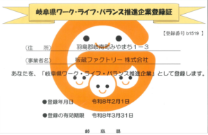 2026.02.03 ニュース 板蔵ファクトリーは「岐阜県ワークライフバランス推進企業」です 板蔵ファクトリー株式会社は、岐阜県より「岐阜県ワーク・ライフ・バランス推進企業」に登録されました 板蔵ファクトリーダウンロード 今後も働きやすさや効率化、技術の研鑽を全て両立できる企業にしていきます。