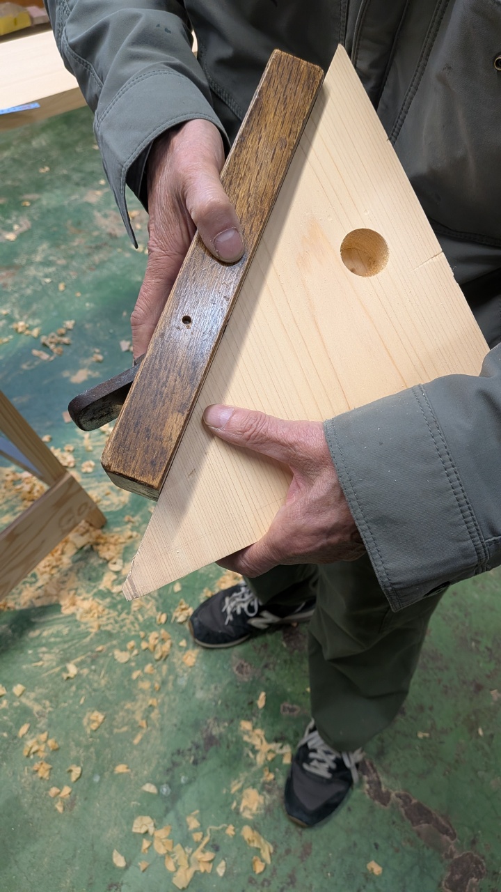そのため、例えばからっと晴れた日に完璧に調整した鉋であっても、雨の日が続くと湿気を吸って台の状態が変わり、削りにくくなってしまうこともあります。 その時々の気候に合わせて、道具の状態を読み切り、常に最良のコンディションに整える。こうした目に見えない細やかな調整の積み重ねが、私たちの製品の仕上がりを支えているのだと改めて実感しました。