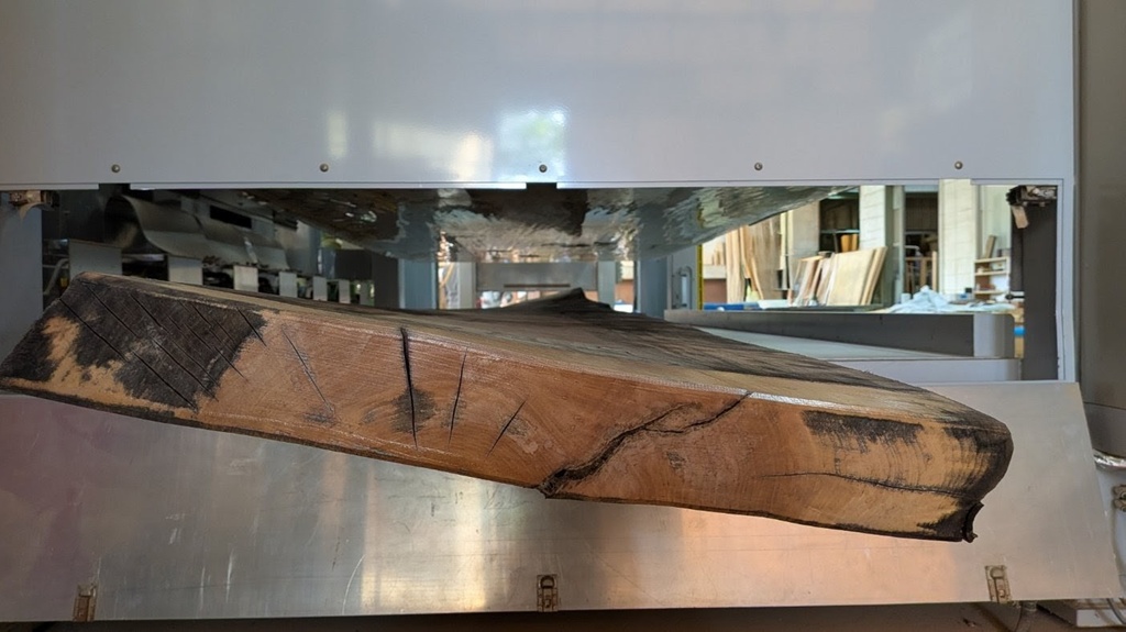 その板は、グループ会社であるヤマガタヤ産業の原板倉庫で、倉庫管理担当の方が見つけました。樹種はミズメザクラ。本来なら非常に美しい木目が特徴の木材ですが、その板はまるで「プロペラ」のように、全体が激しくねじれ切っていました。もちろん、このような状態にならないよう注意して保管はしているのですが、木も生きている以上一定割合ねじれてしまうものも出てしまいます。
