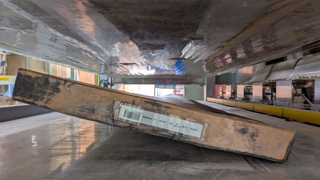 高周波プレスとは、板に圧力をかけながら電磁波を照射し、木の組織を内部から直接加熱する技術です。これにより、木材内部の水分バランスを均一に整えながら、木に蓄積されている「応力(木が曲がろうとする力)」をじわじわと抜いていきます。