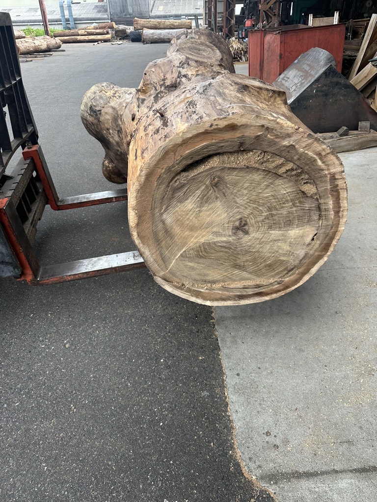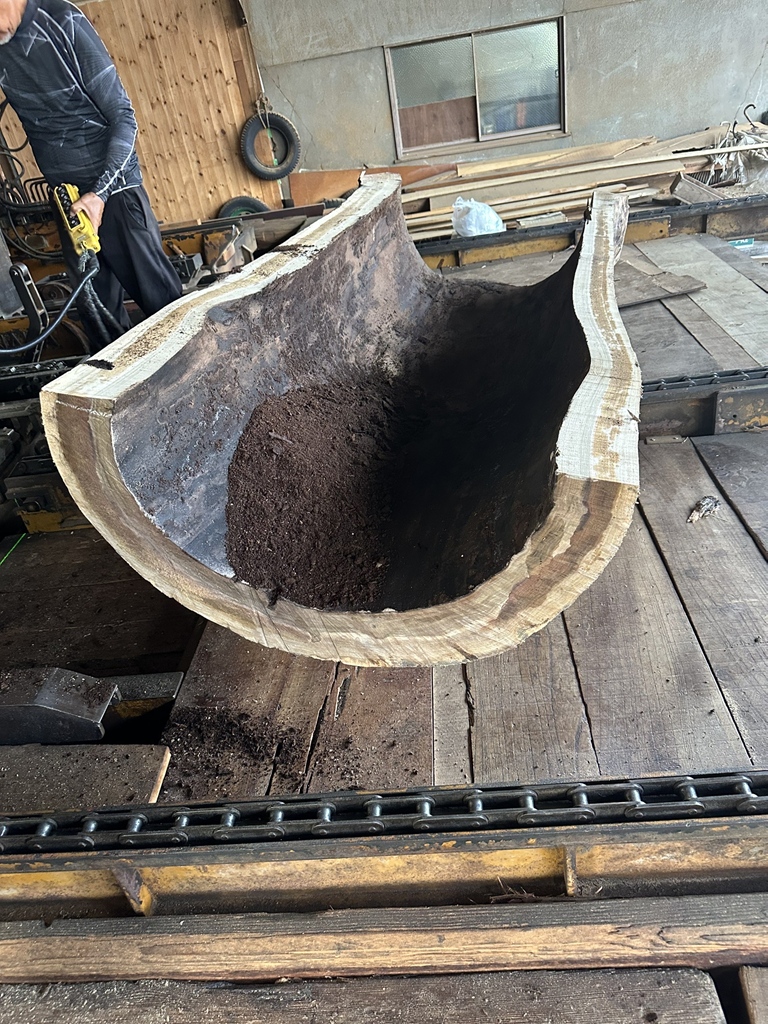 通常は外見や小口に何らかのしるしが出ているなど欠点がわかることも多いですし、一枚板のメーカーとしては「目利き」が大変重要なので鋭意勉強中でもります。それでも、今回のような「中に穴」「中に鳥の巣」「中に大石」など、長年かけてサプライズが形成された丸太にも、ほんの時々出会ってしまいます。