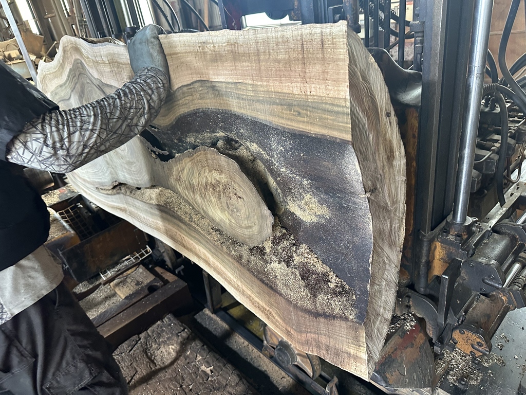 実際にこのような丸太だと「一枚板が何も取れない」という状態になり全くの赤字になってしまうので、ハイリスクビジネスなのです。特にウォールナットは釘が出たり、穴があったり難しい樹種なので、日本でも常時製材するチャレンジャーは数人というレア産業です。しかし、「すごい!」という一枚板を生産していくためにも、「好き」と「こだわり」をを追求する中小企業の粘りの見せ所!と思い、めげずに日々頑張っていきます