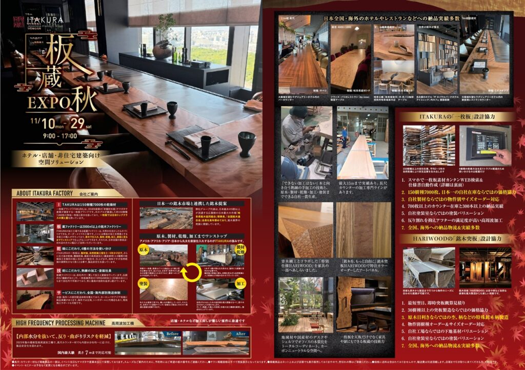 銘木シーズンの11月に、例年好評の板蔵EXPOを開催します。チラシを作成しましたので、近いうちに皆様でお届けいたします。。まずは日程的に、ぜひご来場予定をお願いします!