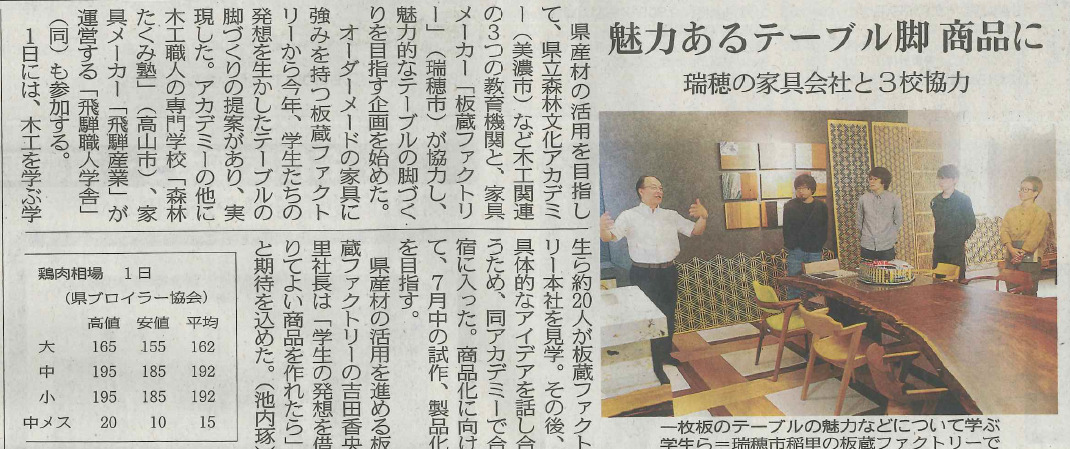 2024.06.05 新聞 6/2 中日新聞 「魅力あるテーブル脚を商品に 瑞穂の家具会社と木工関連3校が協力」 6月2日の中日新聞に、弊社と県立森林文化アカデミー・森林たくみ塾・飛騨職人学舎の3校が連携してのテーブル脚開発連携プロジェクトについての記事が掲載されました。 プロジェクトの詳細については、以下の記事をご覧ください。 岐阜の未来の森と人を育てる【学校・企業連携プロジェクト始動】3校合同特別授業
