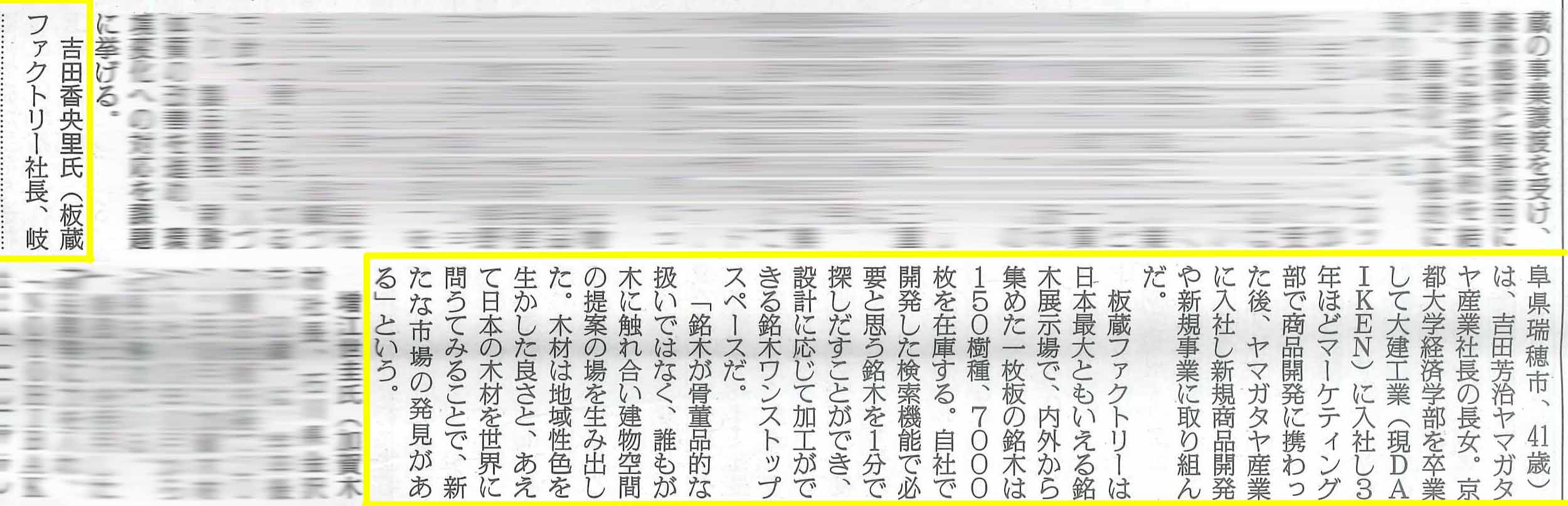 2025.10.15 新聞 10/9 日刊木材新聞「10年後を託すこの人たち」に板蔵ファクトリー社長が掲載されました 10月9日の日刊木材新聞の特集コーナー「10年後を託すこの人たち」にて、弊社社長の吉田香央里の紹介と顔写真が掲載されました。 記事では、板蔵ファクトリー社長の来歴と検索システムや銘木の在庫などの紹介がされています。 購読されている方はぜひお読みくださると幸いです。